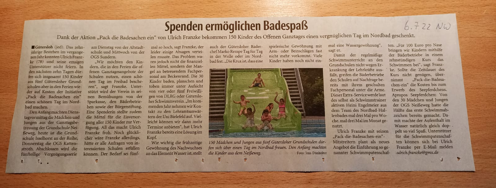 Gütersloh: Spenden ermöglichen Badespaß (Neue Westfälische, 06.07.2022)